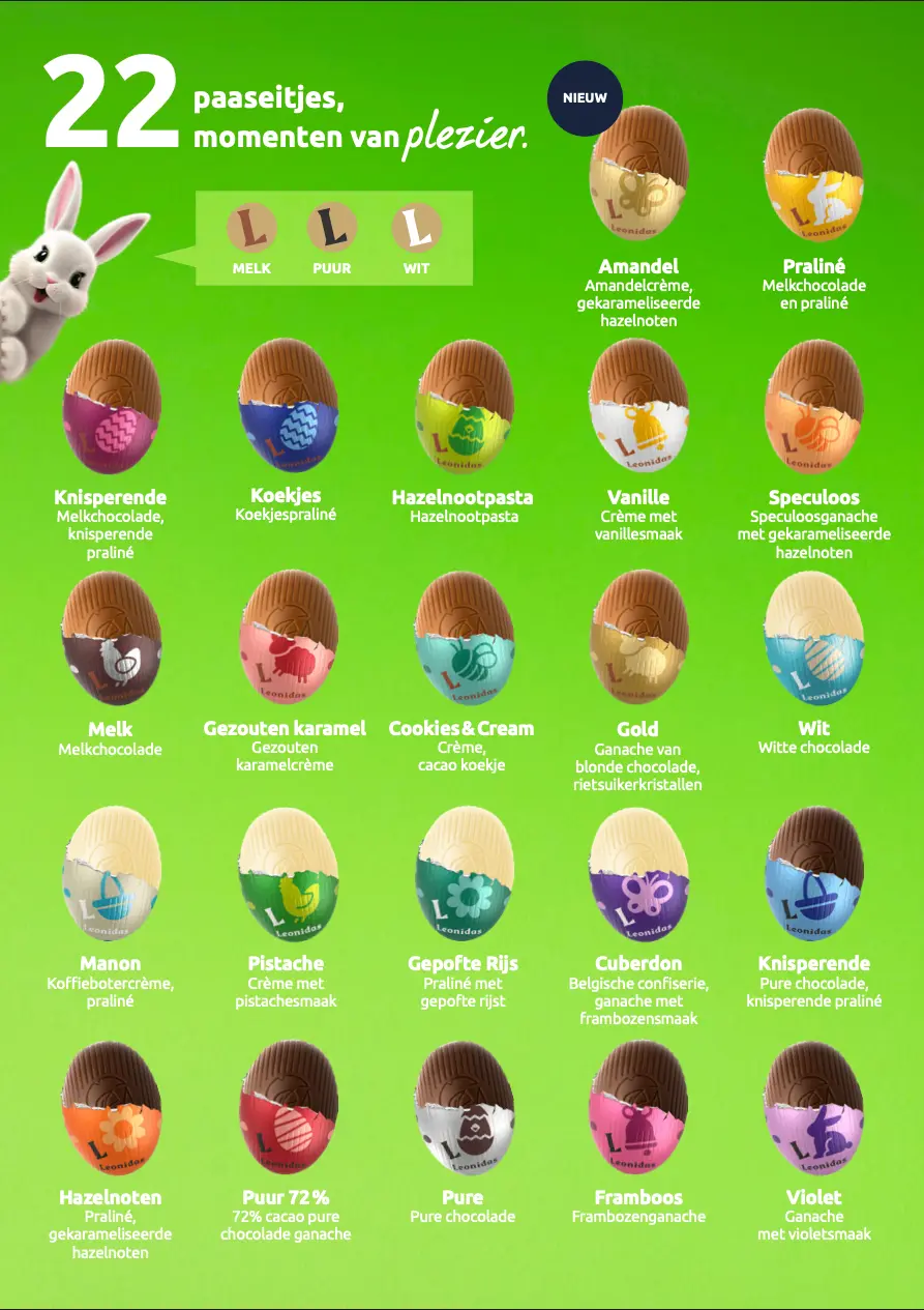 Met trots presenteren we maar liefst 22 verschillende paaseitjes, allemaal onweerstaanbaar lekker! En dat is nog niet alles: we hebben zelfs een aantal verlaagd in suiker opties toegevoegd. Leonidas brengt kleur en smaak naar de paaseierenzoektochten van 2026! Geniet van de kwaliteit van Belgische chocolade, gemaakt met 100% pure cacaoboter, duurzame cacao en natuurlijk zonder palmolie.